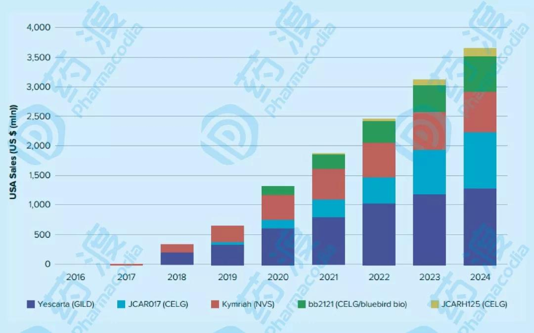 未來(lái)5年美國(guó)Car-T細(xì)胞產(chǎn)品銷(xiāo)售額(來(lái)源:Evaluate pharma)
