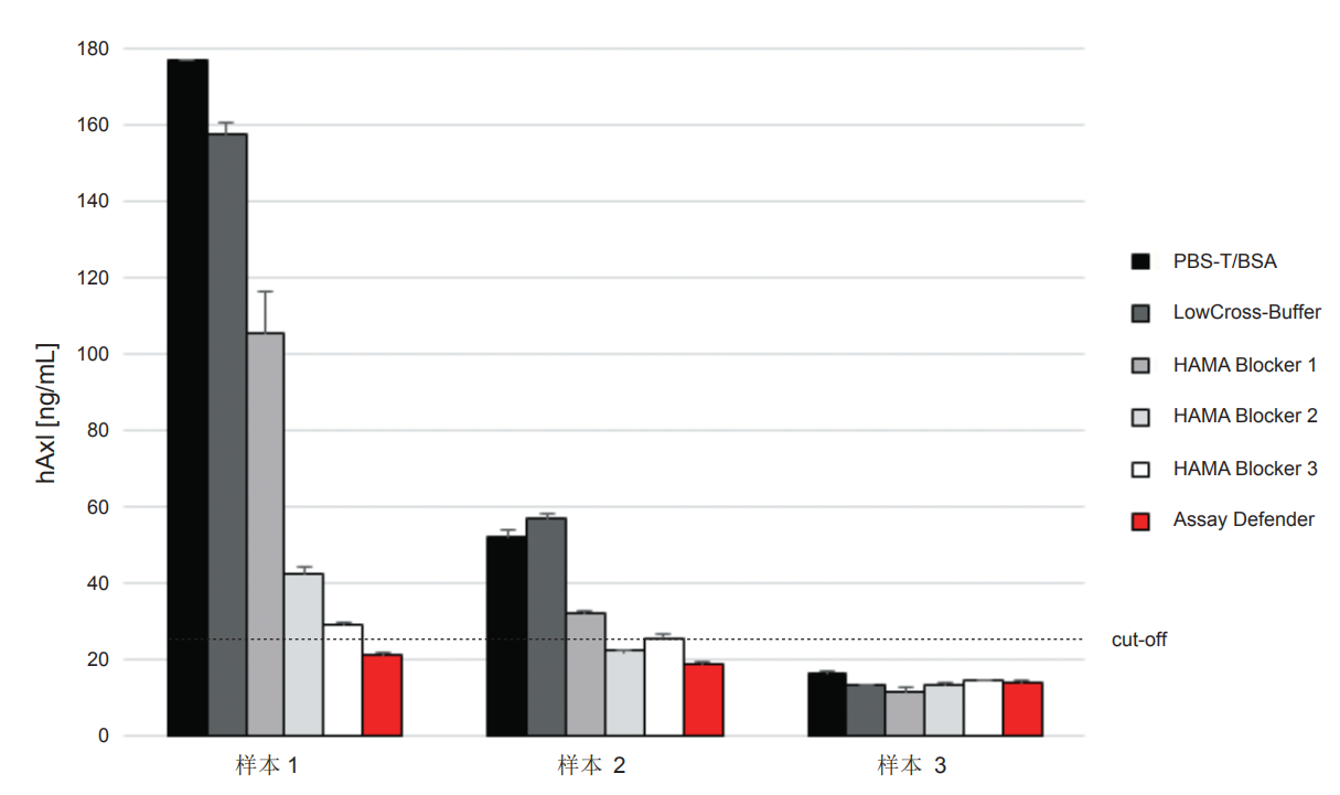 使用ELISA方法,檢測(cè)來(lái)自類(lèi)風(fēng)濕性疾病患者(樣本1和2)的血清樣本中肝癌細(xì)胞生物標(biāo)記物hAxl的表達(dá)情況。樣本3是來(lái)自健康人的無(wú)干擾血清樣本。樣本分別用單獨(dú)PBS-T/BSA、PBS-T/BSA +HAMA Blocker 1/HAMA Blocker 2 / HAMA Blocker 3、CANDOR的Assay Defender®進(jìn)行稀釋。單 獨(dú) 使 用 Assay Defender®即可完全消除干擾,因此對(duì)這兩組干擾樣本給出正確的陰性結(jié)果 (< 25 ng/mL) 。 無(wú) 干 擾 的 樣 本 結(jié) 果 不 受 Assay Defender®影響。