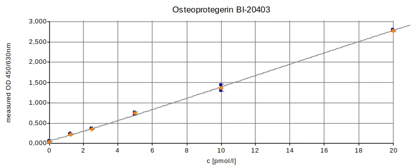The human Osteoprotegerin ELISA kit (OPG) is a 4.5 hour, 96-well sandwich ELISA for the quantitative determination of OPG in human serum and plasma. The Osteoprotegerin kit employs human serum-based standards to ensure the measurement of biologically reliable data.