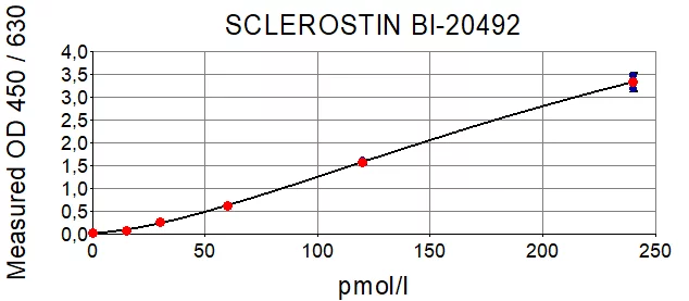 The human Sclerostin ELISA kit is an overnight, 96-well sandwich ELISA for the quantitative determination of human Sclerostin in serum, plasma, urine and cell culture supernatant. The Sclerostin ELISA employs human serum-based standards to ensure the measurement of biologically reliable data. The Sclerostin ELISA assay uses highly purified, epitope mapped antibodies.