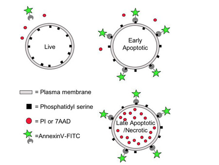 目前至少有十?dāng)?shù)種檢測細(xì)胞凋亡的方法,從大框架上講,可以劃分為基于細(xì)胞形態(tài)、生物學(xué)功能和生化標(biāo)記三大類。這里簡要介紹一下最受歡迎的“Annexin V/PI雙染法”進行流式細(xì)胞術(shù)質(zhì)膜分析。
