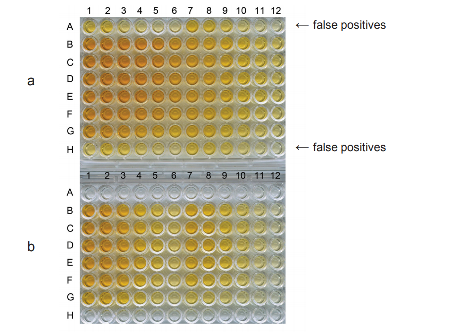 Figure 2: Prevention of false-positive binding using LowCross-Buffer® in an ELISA against guinea-pig IgG. With the standard assay buffer (a), false positives in the specificity control (row A) and in the blank values (row H) spoiled the interpretations and evaluation. The use of LowCross-Buffer® (b) prevented all false-positive signals. Assay performed by Dr. C. Specht (PARA Bioscience GmbH (now vivo Science GmbH), Gronau, Germany)