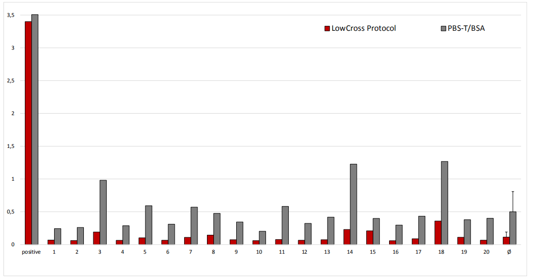 Figure 3: Improving an RBD-based SARS-CoV-2 antibody ELISA using LowCross-Buffer. Comparison of negative samples (# 1-20; Ø is arithmetic mean of 1-20) LowCross protocol vs. the standard diluent PBS/Tween/BSA (PBS-T/BSA). Samples were analyzed either using the CANDOR solutions, including LowCross-Buffer, or a standard PBS-T/BSA protocol. The LowCross protocol allows for less average background, less sample-to-sample variation, a better signal-to-noise-ratio, and a better detection limit due to a decreased cut-off. (Samples provided by in.vent Diagnostica GmbH, Henningsdorf, Germany.)