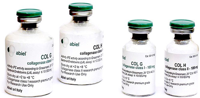 Abiel利用一項(xiàng)專利技術(shù)在大腸桿菌中合成了創(chuàng)新型的高純度、高純度、高穩(wěn)定性的重組膠原酶Ⅰ型(COL G)和Ⅱ型(COL H)。根據(jù)應(yīng)用,COL G與COL H結(jié)合使用,可用于解離不同的功能細(xì)胞。重組膠原酶是基于活性測定而不是重量比。