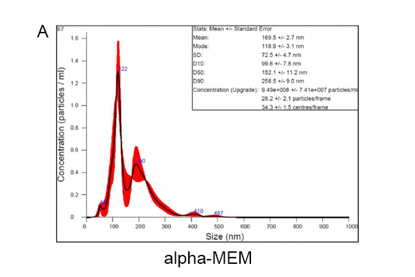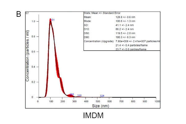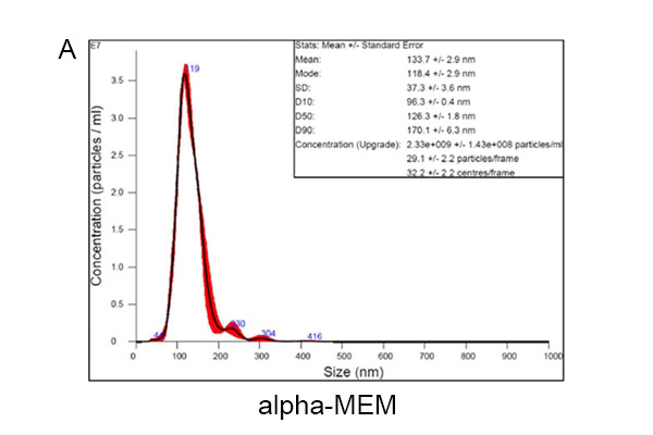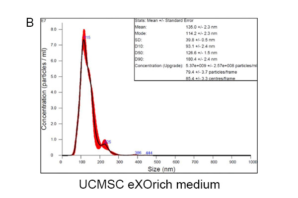 類似的實(shí)驗(yàn)數(shù)據(jù)可以重復(fù)使用另一種培養(yǎng)基,UCMSC eXOrich培養(yǎng)基。使用α-MEM培養(yǎng)基的UCMSC分泌外泌體直徑為118.4±2.9 nm,外泌體濃度(50-200 nm)為2.22×10?±1.45×10?顆粒/mL(圖2A)。使用UCMSC eXOrich培養(yǎng)基的UCMSC分泌外泌體直徑為114.2±2.3 nm,濃度(50-200nm)為4.99×10?±2.85×10?顆粒/mL(圖2B),高于α-MEM。