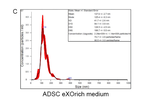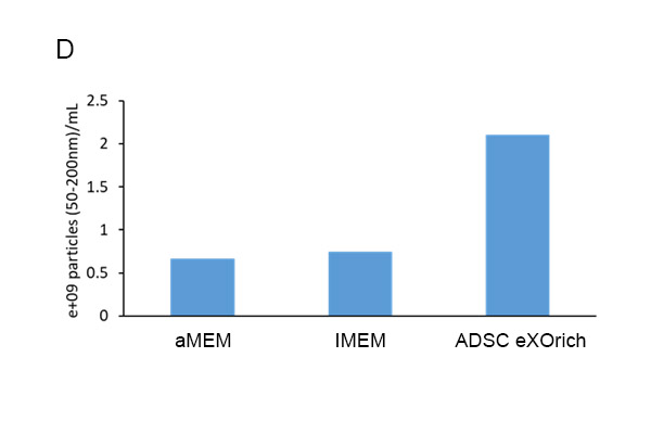 我們的結(jié)果顯示,使用α-MEM(圖1A)、IMDM(圖1B)和ADSC ADSC培養(yǎng)基(圖1C)培養(yǎng)獲得的常見(jiàn)外泌體粒徑分別為118.9±3.1、100.6±1.3和125.4±8.3。使用α-MEM、IMDM和ADSC eXOrich培養(yǎng)基的ADSCs分泌的外泌體(50-200 nm)的濃度(顆粒/mL)分別為6.63×10?±5.35×10?、7.37×10?±1.15×10?和2.11×10?±1.40×10?。ADSC eXOrich培養(yǎng)基比α-MEM或IMDM更能增加外泌體的產(chǎn)量(圖1D)。
