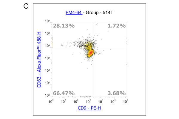 根據(jù)FCM分析數(shù)據(jù),我們可以驗(yàn)證使用ADSC eXOrich培養(yǎng)基產(chǎn)生的外泌體是否表達(dá)CD9、CD63和CD81。為了總結(jié)FCM分析結(jié)果,我們鑒定了一群至少直徑為68到155 nm的膜結(jié)構(gòu)的粒子。這些顆粒含有CD9、CD63和CD81,它們被認(rèn)為是外泌體標(biāo)記物。