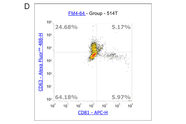 此外,我們還使用流式細(xì)胞術(shù)分析了外泌體表面標(biāo)記物: CD9、CD63和CD81的表達(dá)。實(shí)驗(yàn)流程根據(jù)Pospichalova V等人的文章描述進(jìn)行[7]。我們利用參考珠:NanoFCM? Silica Nanospheres Cocktail #1,直徑從68到155納米,來(lái)設(shè)置光電倍增管的電壓和光散射的閾值(圖3A)。膜特異性、熒光兩親性苯乙烯基染料FM4-64被用于標(biāo)記外泌體,因?yàn)橥饷隗w具有脂質(zhì)雙層的單膜結(jié)構(gòu)。為了獲得更準(zhǔn)確的數(shù)據(jù),我們使用熒光減去一(FMO)對(duì)照來(lái)確定背景熒光和外泌體樣本中陽(yáng)性群體產(chǎn)生的熒光之間的cut-off值。對(duì)使用ADSC eXOrich培養(yǎng)培養(yǎng)的ADSC分泌的外泌體進(jìn)行FCM分析FCM分析結(jié)果顯示,在FM4-64染色后,一個(gè)升高的群體出現(xiàn)了熒光信號(hào)(圖3B)。對(duì)該群體進(jìn)行設(shè)門,分析CD9、CD63和CD81的表達(dá)。在這里,我們給出了CD63與CD9(圖3C)和CD63與CD81的點(diǎn)圖分析結(jié)果(圖3D)。